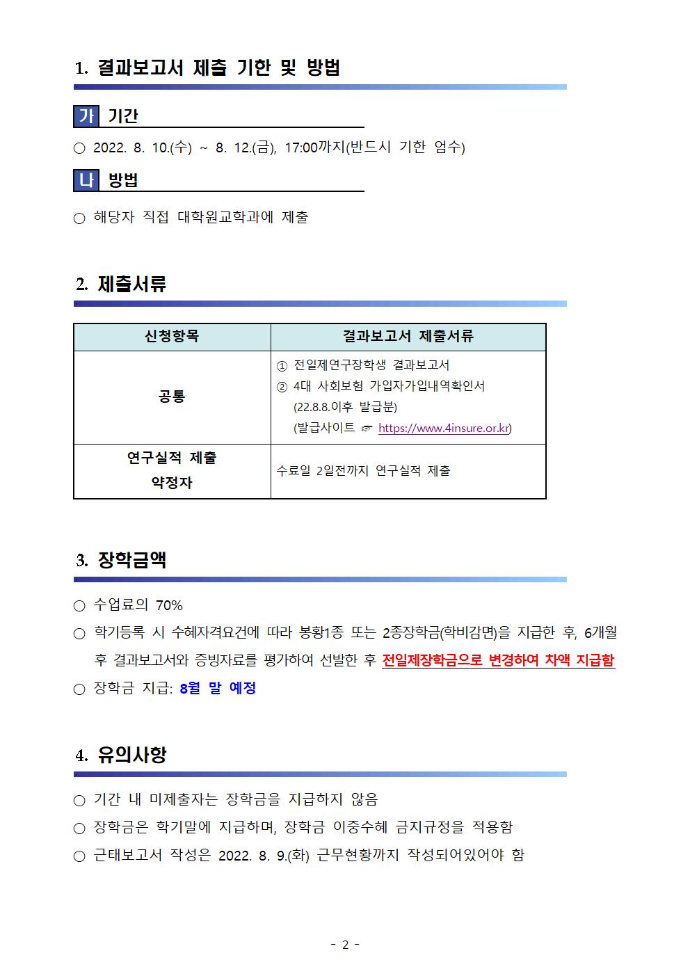 공지사항 홈알림방공지사항 [장학] 2022-1학기 대학원 전일제연구장학생 결과보고서 제출 안내 [장학] 2022-1학기 대학원 전일제연구장학생 결과보고서 제출 안내 대학원2022-07-27 페이스북 트위터 구글플러스 이메일 프린트 [전일제연구장학생 결과보고서 서식] ☜☜클릭하여 다운로드 이전공지사항다음