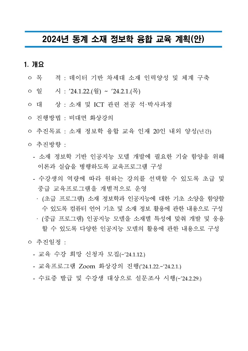외부공고 홈알림방외부공고 한국표준과학연구원) 2024년 동계 소재 정보학 융합 교육 참여 요청 한국표준과학연구원) 2024년 동계 소재 정보학 융합 교육 참여 요청 대학원2023-12-21 페이스북 트위터 구글플러스 이메일 프린트 붙임 2. 2024년 동계 소재 정보학 융합 교육 신청서 이전외부공고다음