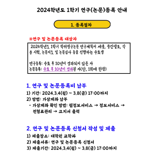 공지사항 홈알림방공지사항 2024학년도 1학기 수료생 연구등록 및 논문등록 안내 2024학년도 1학기 수료생 연구등록 및 논문등록 안내 대학원2024-02-21 페이스북 트위터 구글플러스 이메일 프린트 1. 연구등록 및 논문등록 신청서 다운로드(클릭하세요) 2. 연구(논문)등록비 납부 매뉴얼 다운로드(클릭하세요) 이전공지사항다음