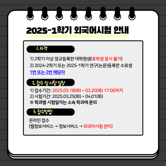 공지사항 홈알림방공지사항 [시험]2025학년도 1학기 외국어시험 안내 [시험]2025학년도 1학기 외국어시험 안내 대학원2025-02-24 페이스북 트위터 구글플러스 이메일 프린트 이전공지사항다음