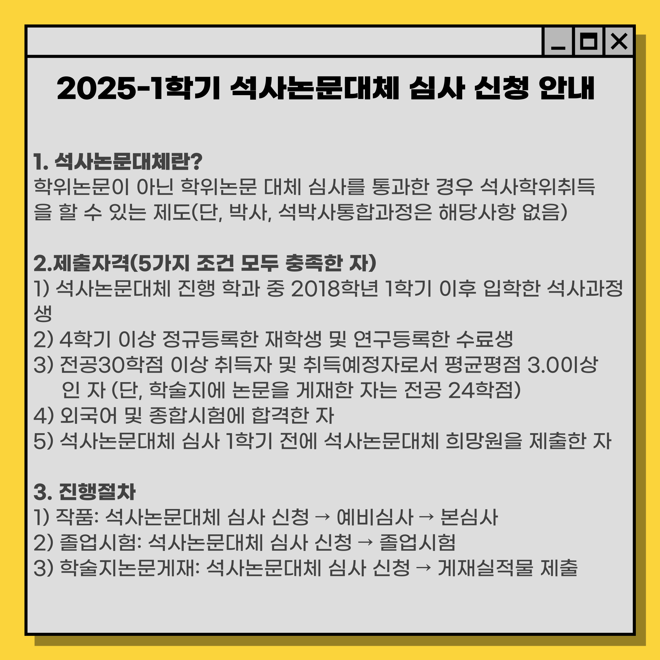 공지사항 홈알림방공지사항 [졸업]2025학년도 1학기 석사학위논문대체 심사신청 안내 [졸업]2025학년도 1학기 석사학위논문대체 심사신청 안내 대학원2025-04-30 페이스북 트위터 구글플러스 이메일 프린트 ▶석사논문대체 가능 학과 명단 석사논문대체 가능 학과 명단 다운로드 ▶석사논문대체 제출 서류 석사논문대체 제출 서류 다운로드 이전공지사항다음