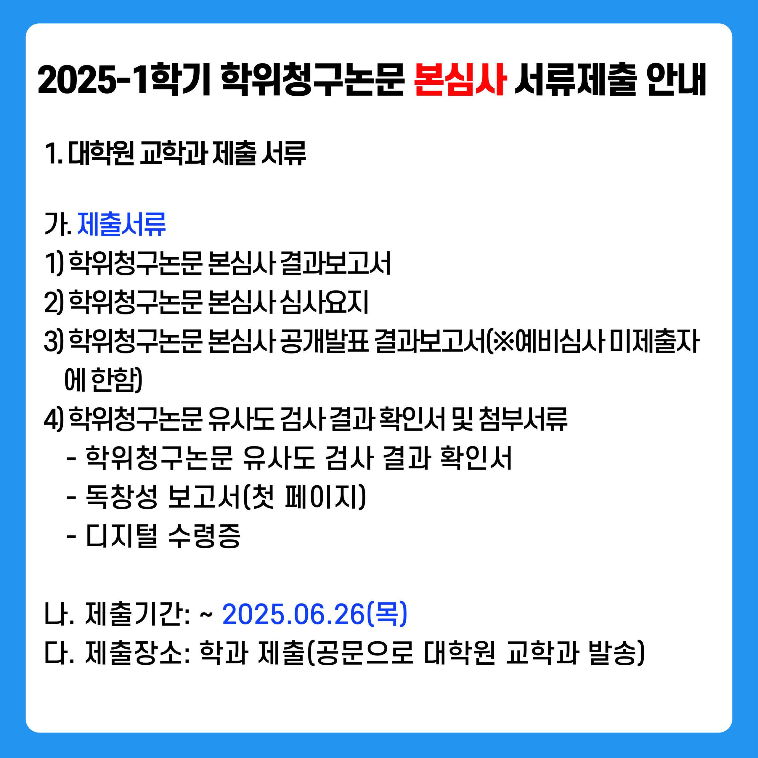 공지사항 홈알림방공지사항 [논문]2025-1학기 학위청구논문 본심사 서류제출 안내 [논문]2025-1학기 학위청구논문 본심사 서류제출 안내 대학원2025-05-23 페이스북 트위터 구글플러스 이메일 프린트 1. 학위청구논문 연구계획서 제목변경원 제출하기(↓↓ 클릭하기) ▶ 학위청구논문 연구계획서 제목변경원 제출 바로가기(클릭하세요!!) 2. 학위청구논문 제목변경원 양식 다운로드 이전공지사항다음