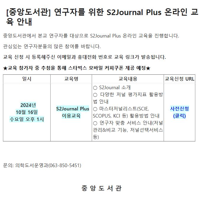 공지사항 홈알림방공지사항 연구자를 위한 S2JOURNAL PLUS 온라인 교육 안내 연구자를 위한 S2JOURNAL PLUS 온라인 교육 안내 대학원2025-10-13 페이스북 트위터 구글플러스 이메일 프린트 S2Journal Plus 이용 교육 참가 방법 안내 다운로드 이전공지사항다음