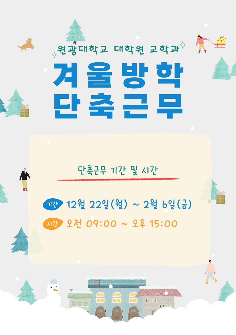 공지사항 홈알림방공지사항 2025학년도 동계방학 단축근무 안내 2025학년도 동계방학 단축근무 안내 대학원2025-12-29 페이스북 트위터 구글플러스 이메일 프린트 [2025학년도 동계방학 단축근무 안내] 2025학년도 동계방학 중 단축근무를 다음과 같이 시행하오니 학사업무에 차질이 없도록 참고하시기 바랍니다. 겨울방학 단축근무 기간 및 근무 시간 25. 12. 22 (월) ~ 26. 02. 06 (금) 오전 09:00 ~ 오후 15:00 (오후 12:00 ~ 오후 13:00 점심시간) 이전공지사항다음