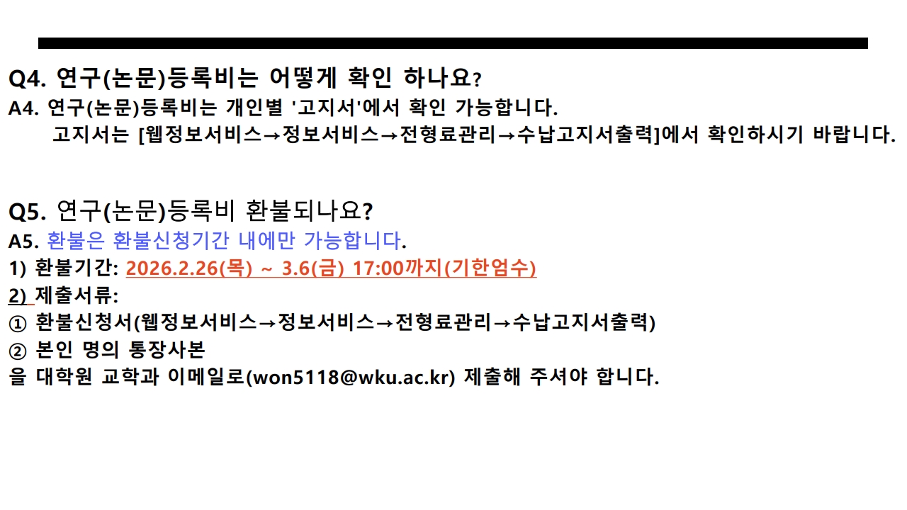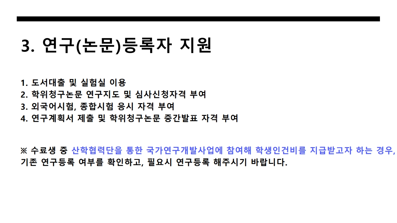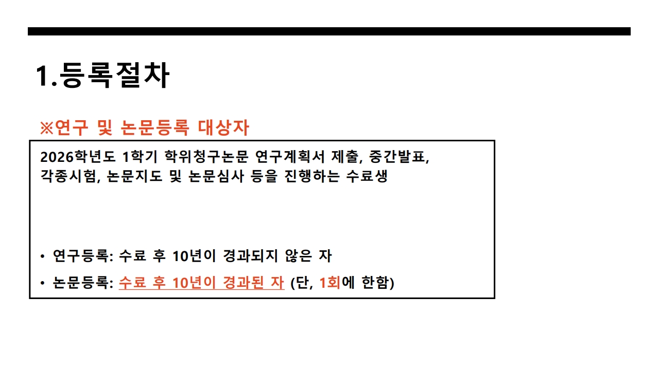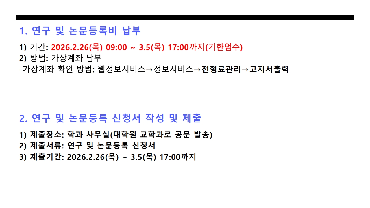 공지사항 홈알림방공지사항 2026학년도 1학기 수료생 연구등록 및 논문등록 안내 2026학년도 1학기 수료생 연구등록 및 논문등록 안내 대학원2026-02-25 페이스북 트위터 구글플러스 이메일 프린트 ▶ 연구등록 및 논문등록 신청서 다운로드(클릭하세요) ▶ 연구(논문)등록비 납부 메뉴얼 다운로드(클릭하세요) 이전공지사항